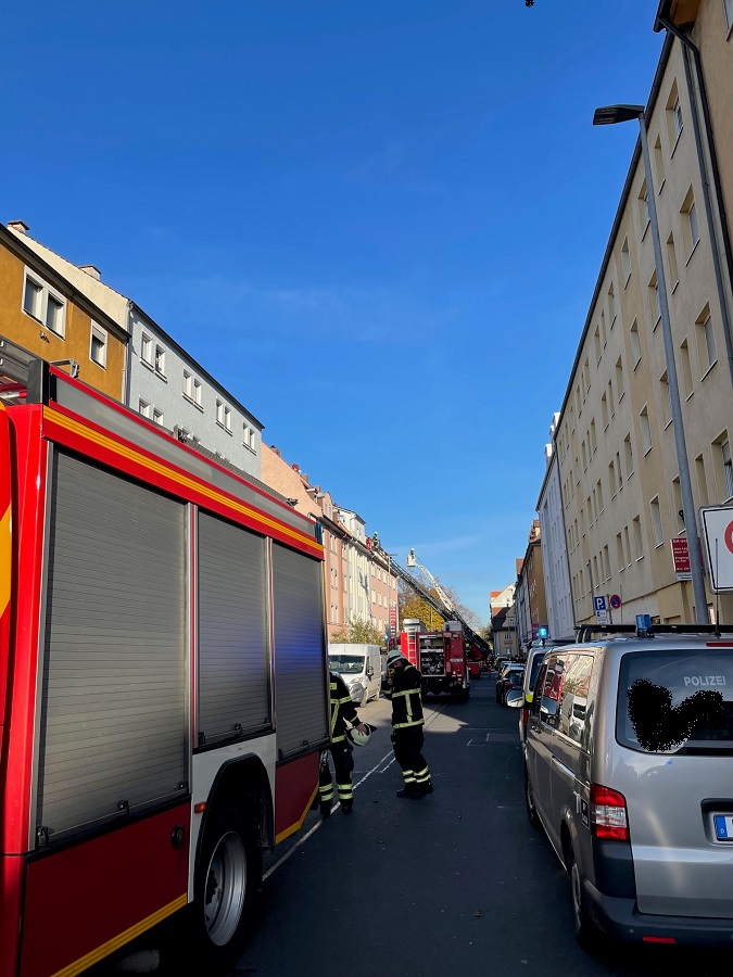 Am heutigen Dienstag kam es um 13:45 Uhr zu einem Brand in einem 5-stöckigen Mehrfamilienhaus in der Schweinfurter Ludwigstraße. Die Integrierte Leitstelle alarmierte nach mehreren eingegangenen Meldungen mit dem Stichwort „Brand 3 – Person in Gefahr“ die Ständige Wache, die Freiwillige Feuerwehr Schweinfurt sowie die Werkfeuerwehr SKF, da sich Kräfte der Ständigen Wache noch in einem Paralleleinsatz befanden. Vor Ort bot sich den Einsatzkräften eine höchst kritische Einsatzlage, bei welcher der Eingangsbereich des Treppenhauses in Vollbrand stand und sich mehrere Personen auf Dächern bzw. an Fenstern befanden. Erste Rettungs- und Löschversuche waren bereits durch die anwesende Bereitschaftspolizei unternommen worden. Umgehend wurde durch die Feuerwehr die Menschenrettung über Hubrettungsfahrzeuge und Trupps im Innenangriff eingeleitet, wodurch letztlich 8 Personen über Leitern und 2 durch einen vorgehenden Angriffstrupp mit Fluchthaube über den zwischenzeitlich abgelöschten Treppenraum gerettet werden konnten. Zur Absicherung der absturzgefährdeten Personen kam zudem ein Sprungpolster im Innenhof zum Einsatz. Bereits während der Erstphase erhöhte der einsatzleitende Stadtbrandinspektor die Alarmstufe auf Brand 4 (B 4), was die Alarmierung der Unterstützungsgruppe Einsatzleitung (UG-EL/ÖEL) sowie eines weiteren HLF der FF Niederwerrn zur Folge hatte. Nach abschließender Kontrolle des gesamten Gebäudekomplexes durch mehrere Trupps unter schwerem Atemschutz konnte der Einsatz um 15.45 Uhr beendet werden.